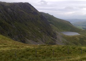 It started with a steady climb up the side of Hengwm valley on a clear path, but then I split off for a direct climb up to top of Pen Yr Allt Uchaf. The climb is hard work and with hindsight I’d recommend following the main path up and tracking back to the indistinct summit. After Pen Yr Allt Uchaf it’s a fairly straightforward walk across to Drysgol and Aran Fawddwy itself, though I managed to wander of track slightly and had to do some bracken bashing and heather hopping as a consequence. I (deliberately) detoured off to include the less than remarkable summit of Gwaun Lydan, which provides good views particularly of Aran Fawddwy itself. Drysgol provide another fine perspective and has a poignant memorial to a member of a RAF mountain rescue team killed by lightening while on duty in the area. From then on it’s a good steady walk up to the spectacular Aran Fawddwy and then along the ridge to Aran Benllyn (via the intermediate Erw Y Ddafod-Ddu.) On a fine day the views must be wonderful but even with clouds and mist (and eventually strong rain) it was still impressive: looking south to Pumlumon, west to Cadair Idris, across the Arans and north to Bala. There is also the precipitous view down to Creiglyn Dyfi, the lake beneath the east face of the Aran Fawddwy ridge.