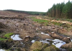 The next stage was always likely to be the trickiest. Following the Nuttalls route, I was aiming for a cut through the forest to join the forest track but a large area of woodland had been cut down and the path wasn,t clear, if it still existed. So I headed off across a desolate landscape of stumps, logs, branches, mossy hummocks, bog and streams. I could see diggers parked at the start of a track and that was my rough goal. This was strange walking – bouncing across the firmer ground around the stumps and then working my way across beds of pine branches and boggy patches.