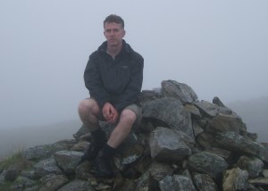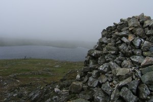 As the ground levels out into the boggy area around a small lake, the paths diverge. To the right is the path to Aran Fawddwy, but this time I passed the lake and went left up the hillside to reach the summit of Glasgwm. On the way to the summit, I could see back to Aran Fawddwy, shrouded in mist, and north to the Arenigs, which were still visible. Heavy cloud was moving in though, and when I reach the summit I was in the thick of it. I was just able to see Llyn y Fign, the moorland lake that lies just below the summit. As I sat eating my sandwich, I thought about how nervous I would have been a couple of years ago finding myself on the hills with mist all around. Now I was confident of the route and my experience and knew there would be little problem (and I wasn’t that surprised when I did get a little lost later on!).