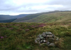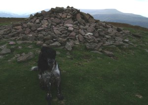 mits starting with Pen Carreg-calch and passing round to Waun Fach and then on to Pen Y Gadair Fawr and Pen Twyn Mawr. I walked the other side of the valley in the winter, but I didn’t have time to do the whole loop, so instead I started from the Grwyne Fawr valley. The biggest benefit of this approach was to give Izzy, our spaniel, a good work out by taking a winding path up through the forest. This was a good way up (as long as you don’t mind getting a bit lost in woodland). It’s then a simple climb up to the summit of Pen Y Gadair Fawr. This is a better peak than the higher – and very boggy – Waun Fach. There are excellent views across the whole of the Black Mountains, even on a cloudy day like this. The wind was bitter for August though, so we moved quickly on to Pen Twyn Mawr skirting the forest at first then across a clear